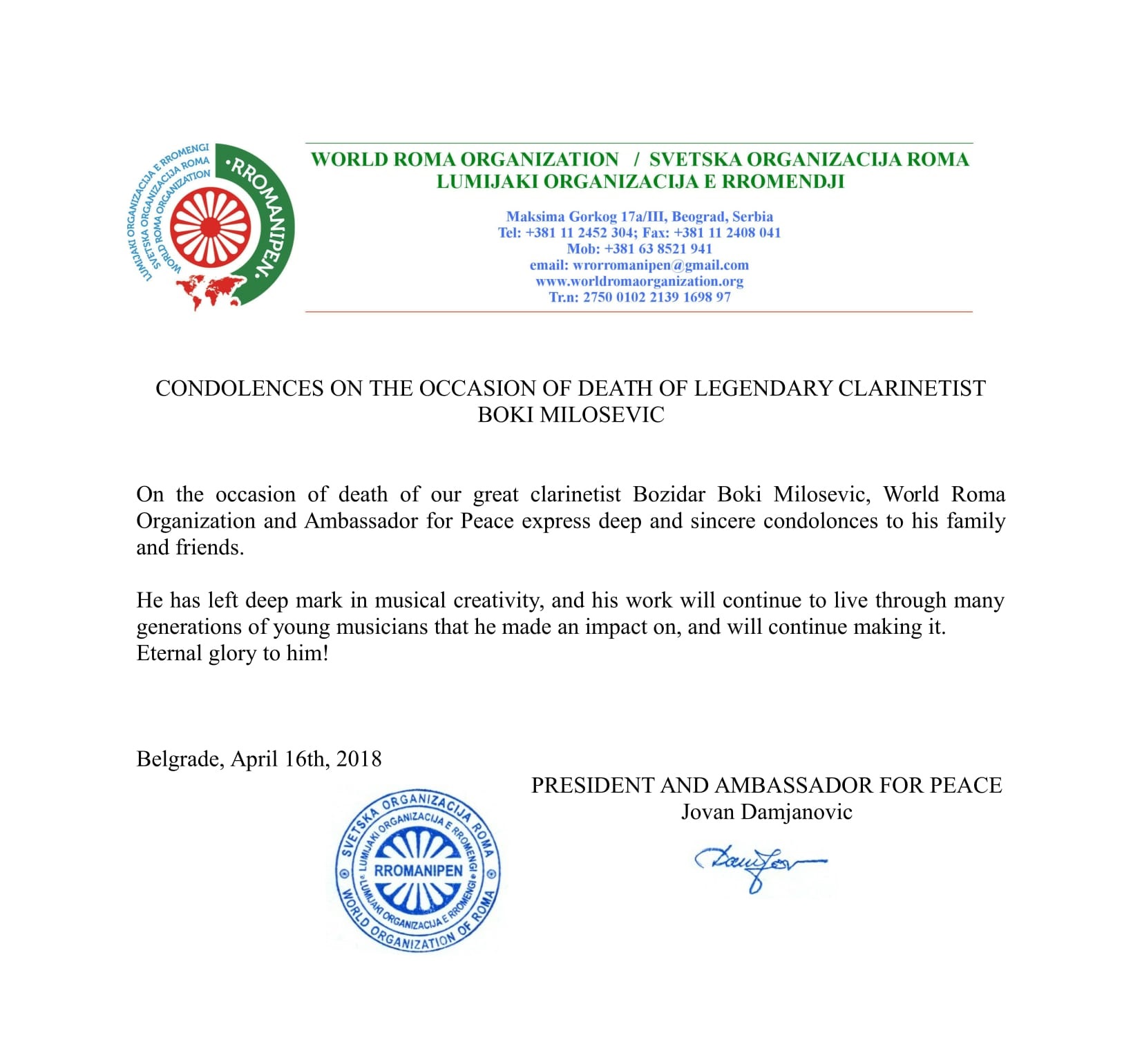 "On behalf of World Roma Organization and myself, I express deep sorrow for the death of the great man and artist Sinan Sakic.