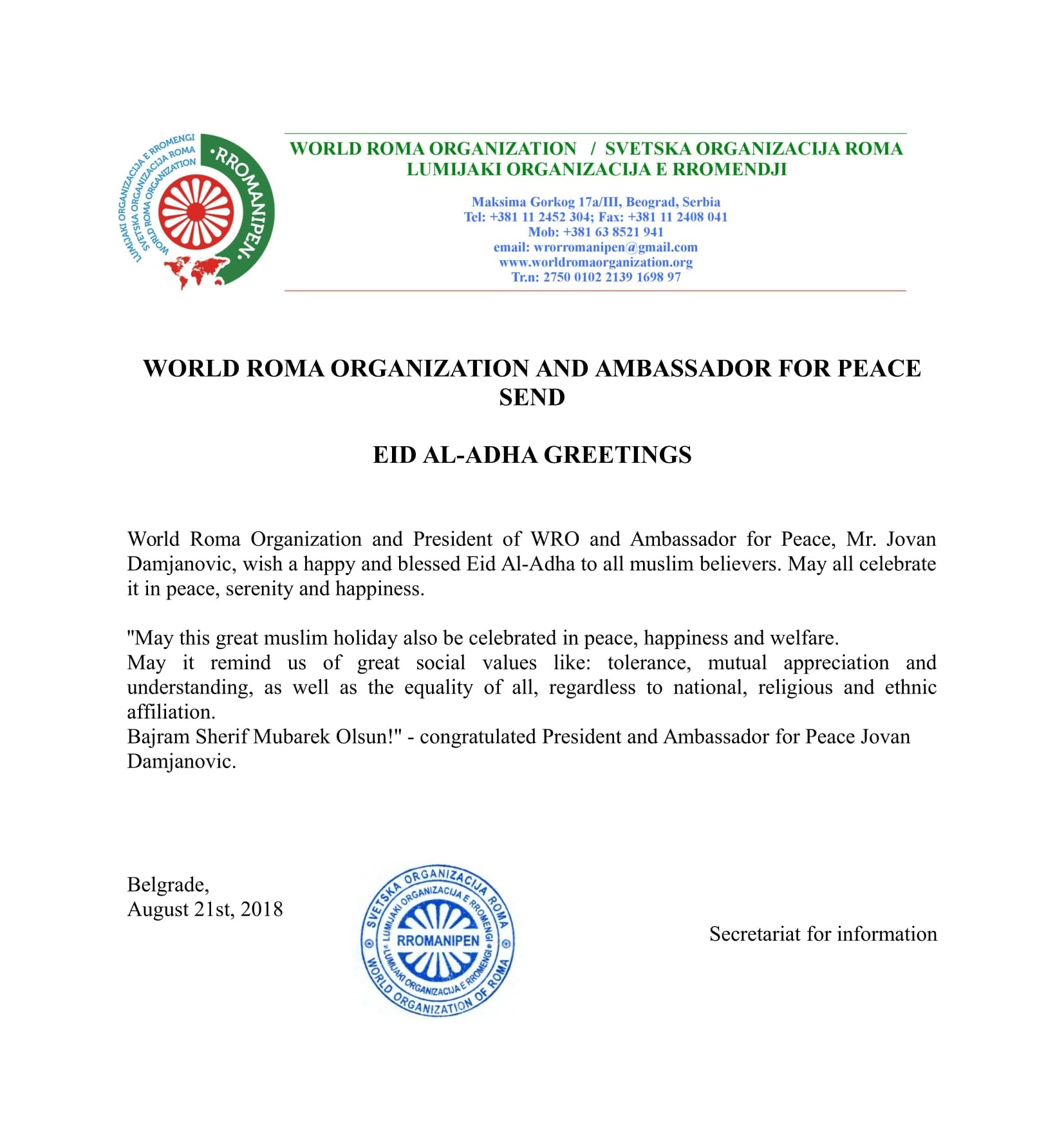 World Roma Organization and President of WRO and Ambassador for Peace, Mr. Jovan Damjanovic, wish a happy and blessed Ramadan to all muslim believers. May all celebrate it in peace, serenity and happiness.